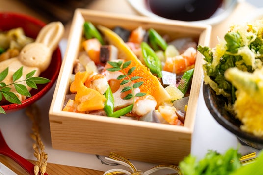 春を象徴する「山や海の幸」と五木茶屋には欠かせない「縁起物」をふんだんに使用。