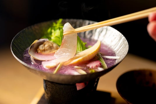 一品目は「春の野山と海の幸 花見鍋」をご用意しました。桃色の霙(みぞれ)を春霞に、抜き型で満開の桜に見立てた、目でも春を感じるお鍋です。桜鯛(開運・めでたい・運気上昇)、ハマグリ(開運・金運・夫婦円満)など、縁起の良い開運食材をふんだんに使用しております。お好みでポン酢とともにお召し上がりください。