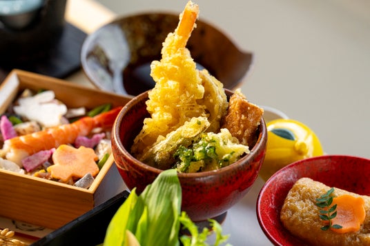 健康長寿と立身出世を願う、海老と山菜の天結び丼。