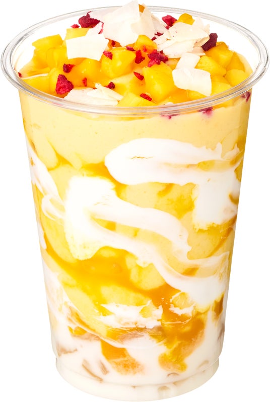 まるで南国のデザートようにマンゴーをたっぷり楽しめるトロピカルなスムージーに、“とろもち”なわらび餅が合わさった、特別感のある味わい。ココナッツチップスの食感もアクセントに。太陽みたいに、気分が明るくなる一杯。