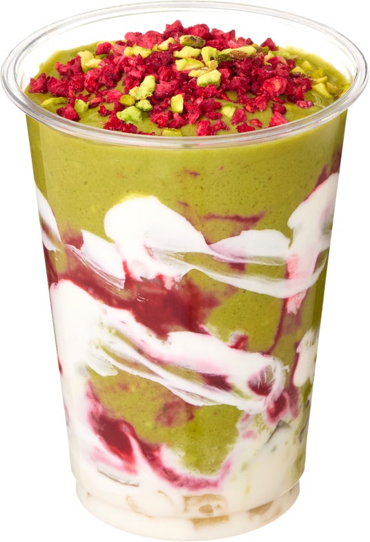 香り高い有機抹茶にクリーミーなアボカドが溶け合う、和と洋をいっぱいに感じられるスムージー。ピスタチオやラズベリーのアクセントと、“とろもち”なわらび餅で、満足感のある一杯。すっきりとリフレッシュしたい時におすすめ。