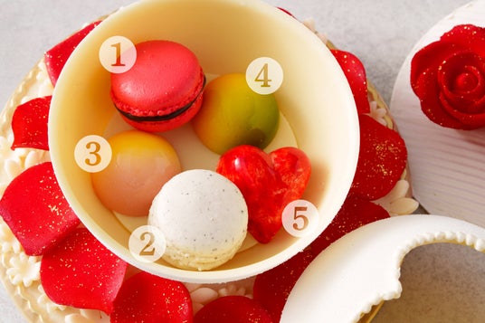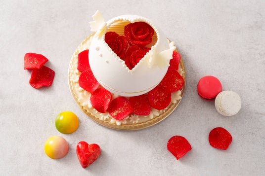 「愛情」の花言葉をもつ深紅のバラがブーケのようにあしらわれており、普段はなかなか伝えられない相手への気持ちを密やかに告げるスイーツです。中には可愛らしいマカロンやボンボンショコラが入っています。受け取った方が思わず笑顔になるようなキュートで情熱的なギフトです。