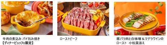 ローストビーフ、豚バラ肉と白味噌&マデラワインのロースト 小松菜添え、鶏胸肉の山賊焼き 青海苔風味のポテト添え、白身魚の白ワイン蒸し ラビゴットソース、ビーフ&マッシュルームピラフ、ラザニア、ローリングピッツァ、菜園風ピッツァ、本日の蒸し野菜、白胡麻のアイオリソース、ミネストローネスープ、神戸ハイカレー(限定50食)、牛肉の煮込み パイ包み焼き【ディナービュッフェ限定】