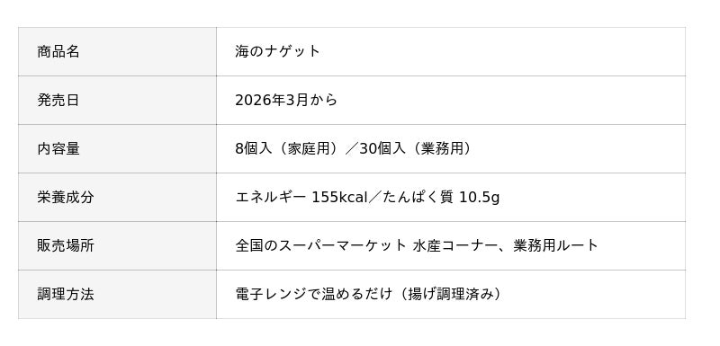 若女食品株式会社(本社:島根県江津市、代表取締役:住田 真一)は、2026年3月1日より、見た目も味も楽しい新商品【海のナゲット】を全国のスーパーマーケット水産コーナーにて発売いたします。