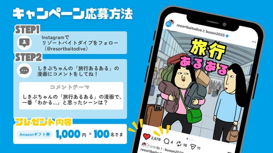 リゾートバイトダイブ公式Instagramアカウントをフォローし、2026年3月2日(月)に投稿されたしきぶちゃんとの共同投稿『旅行あるある漫画』にコメントするだけで応募が完了します。<キャンペーン応募方法>