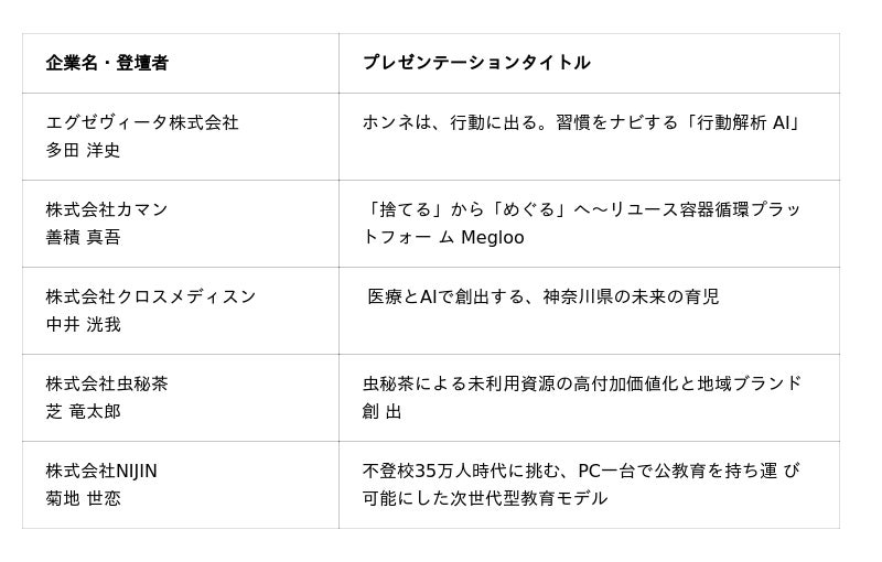 - 予選を通過した5名の起業家が登壇し、社会課題の解決に取り組むビジネスプランを発表します