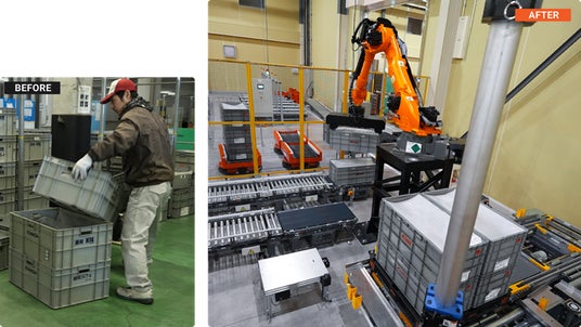 97種の製品を対象に、通い箱デパレタイズ/パレタイズロボットとAGVによる品種別の自動補充を実現。知能ロボットは、ミリ単位の高精度な嵌め合わせや左右部品の混載パレット、サイズ差の大きい通い箱にも柔軟に対応し、高精度な段積みを可能にしています。