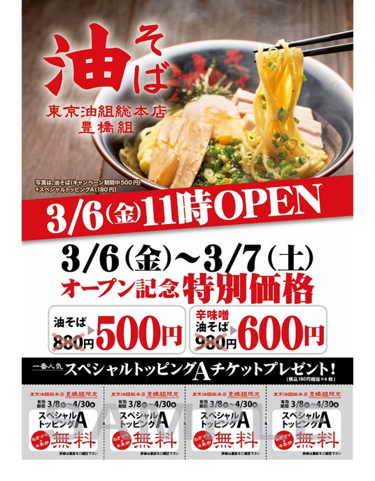 『東京油組総本店 豊橋組』の出店を記念し、2026年3月6日(金)・ 7日(土)の2日間、「油そば」 と 「辛味噌油そば」 を特別価格でご提供いたします!(東京油組総本店 豊橋組のみで実施)