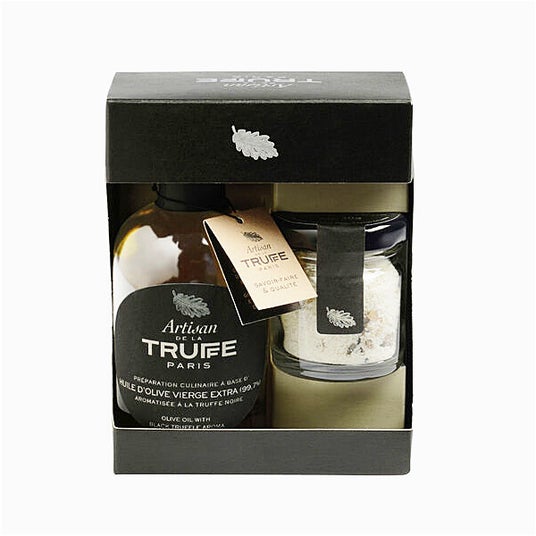 使いやすい小さなサイズのトリュフ入りゲランド塩と黒トリュフオイルのセットです。