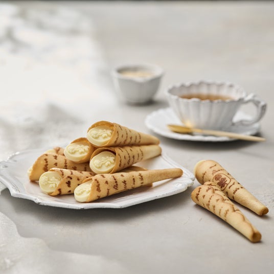 フランス産の発酵バターが香るラングドシャと、ふんわりホワイトチョコクリームのやさしい味わいに、素焼きのアーモンドのアクセントが楽しい、ブーケの形をした焼き菓子です。