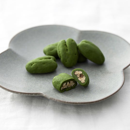 お茶の種に見立てたピーカンナッツを飴がけし、さらにうまみあふれる抹茶チョコレートをたっぷりとまとわせました。