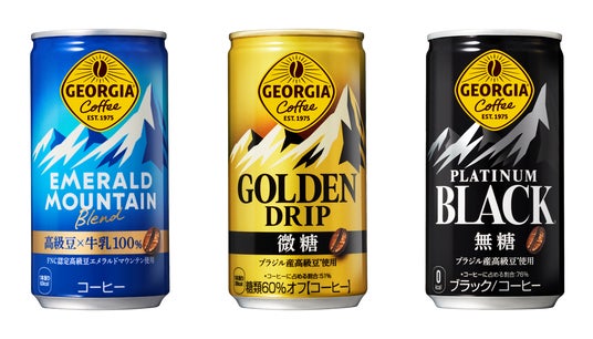 新キャンペーンの開始に伴い「ジョージア」缶製品をはじめとする主要製品がリニューアルして登場。「ジョージア エメラルドマウンテンブレンド」は、厳選された"エメラルドマウンテン豆"と国産牛乳の王道バランスを追及し、さらに心地よい飲み心地をお届けします。「ジョージア ゴールデンドリップ 微糖」は、通常よりも30%多いコーヒー豆※1と独自のダブルアロマ密封技術※2で実現した深いコクと香りはそのままに、印象的な山のイラストをあしらったパッケージに生まれ変わりました。「ジョージア プラチナムブラック」は、厳選されたブラジル産最高等級豆※3と3種類の焙煎度をリニューアルし、香ばしさと深みのあるコクがさらに進化しました。