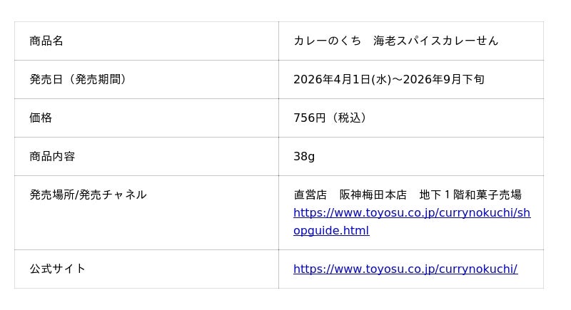 とよす株式会社(本社:大阪府池田市 社長:眞田 昌彦)は、阪神梅田本店に展開しているカレーせんべい専門店「カレーのくち」において、『カレーのくち 海老スパイスカレーせん』を2026年4月1日(水)から期間限定で発売いたします。