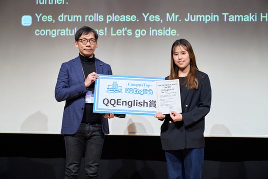 本協定に先立ち、QQEnglishは2026年1月31日に開催された「EMC GLOBAL SUMMIT 2026」において、「QQEnglish賞」を提供。新しい国内留学を推進するプロジェクトJAMP inの廣居 珠紀さんが受賞しました。 本アワードは、課題設定力・構想力・発信力を備えた優秀な学生を表彰するものであり、世界に挑戦するアントレプレナーシップ人材の育成という本協定の理念を体現する取り組みとなりました。本賞を受賞したJAMP in と QQEnglish とは、本包括連携協定の第一歩としてオンライン英会話サービスの提供や、英語学習の継続支援を行うことで合意しています。