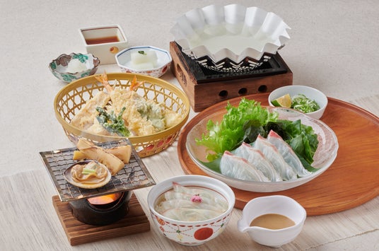 薄造りの鯛をさっとお出汁にくぐらせていただく「鯛しゃぶ」と、旬の素材を楽しめる「春の天ぷら」の両方を楽しめる定食です。