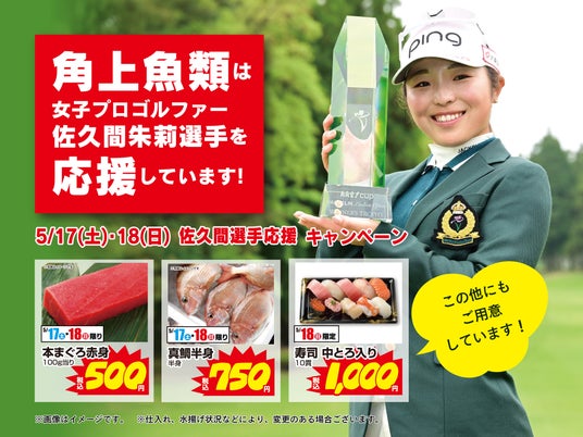 昨年、私ども角上魚類が提供スポンサーとして名を連ねる「ヨネックスレディスゴルフトーナメント」に出場された際、佐久間選手がマグロをお好きだとお聞きし、これは!と張り切って選りすぐりの本まぐろをお届けし、お喜びいただきました。また、オフシーズンには角上魚類川越店をご家族の皆様とともにご利用いただいたり、角上魚類 浦和美園本社まで遊びに来ていただいたり、折に触れ、佐久間選手と接する機会をいただき、明るい笑顔に元気をもらい、より一層、応援の気持ちを強くしております。