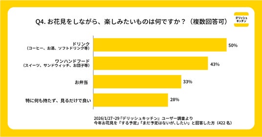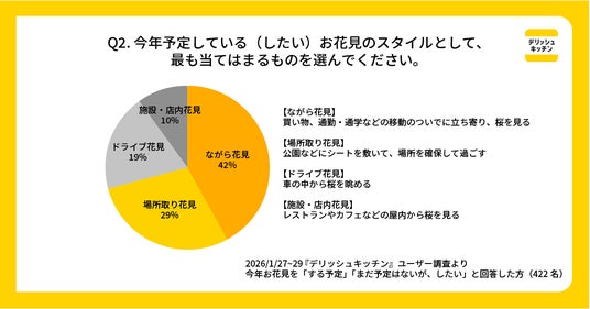 『デリッシュキッチン』ユーザーを対象に実施した調査では、今年お花見をする予定、またはしたいと回答した方は72%でした(する予定:15%、まだ予定はないがしたい:57%)。そのうち、希望するお花見スタイルとして、買い物や通勤・通学などの移動のついでに歩きながら楽しむ「ながら花見」を希望する方が42%で最多に。公園などにレジャーシートを敷いて場所を確保するスタイルよりも多いことが明らかとなりました。
