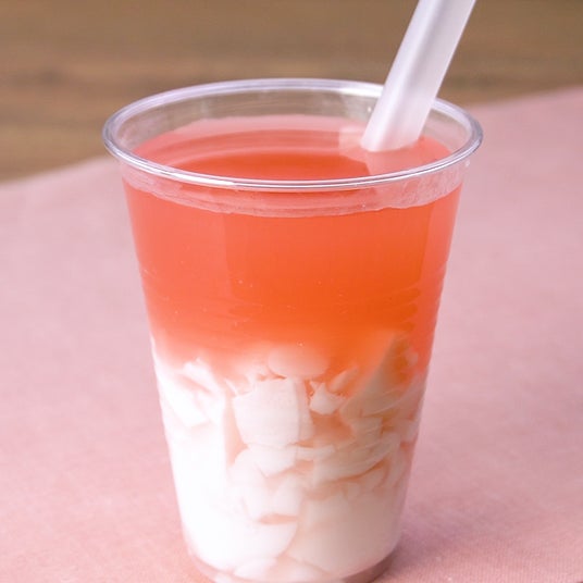白いゼリーとピンク色のドリンクを2層になるように注いでかわいいドリンクを作ります!ヨーグルトは細かくしすぎると混ざってしまうのでなるべく粗めに砕きましょう。アセロラドリンクの代用はアサイー入りのものなどピンク色のものがおすすめです。