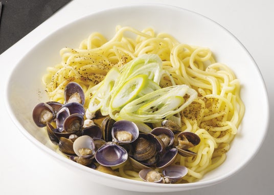 日本三大和牛の一つ、兵庫県産の神戸牛は、きめ細やかな肉質と上品な旨味が特長のブランド牛です。あわせて使用する霧島黒豚は、やわらかな肉質と脂の甘味が評価されているブランド豚。本企画では両素材を組み合わせ、貝出汁の旨味とともに楽しめる陶板焼として仕上げました。肉の旨味はもちろんのこと、その旨味をたっぷり吸った野菜もおすすめです。〆にはしじみちゃんぽん麺で貝出汁とブランド牛、ブランド豚の旨味を最後までお楽しみください。