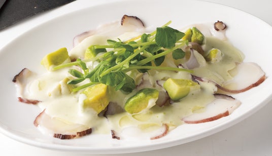 北海道産水ダコは水分を多く含み、身が柔らかくもっちりとした食感が特徴です。噛むほどに旨味が感じられる水ダコを、わさびソースの爽やかな辛味でカルパッチョに仕上げました。