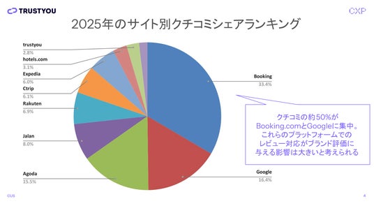 2025年は、Booking.comおよびGoogleの上位2サイトでクチコミ全体の約50%を占める結果となりました。コロナ前の2019年から2023年にかけても、同2サイトが全体の56%を占めており、市場における高い存在感を維持してきました。