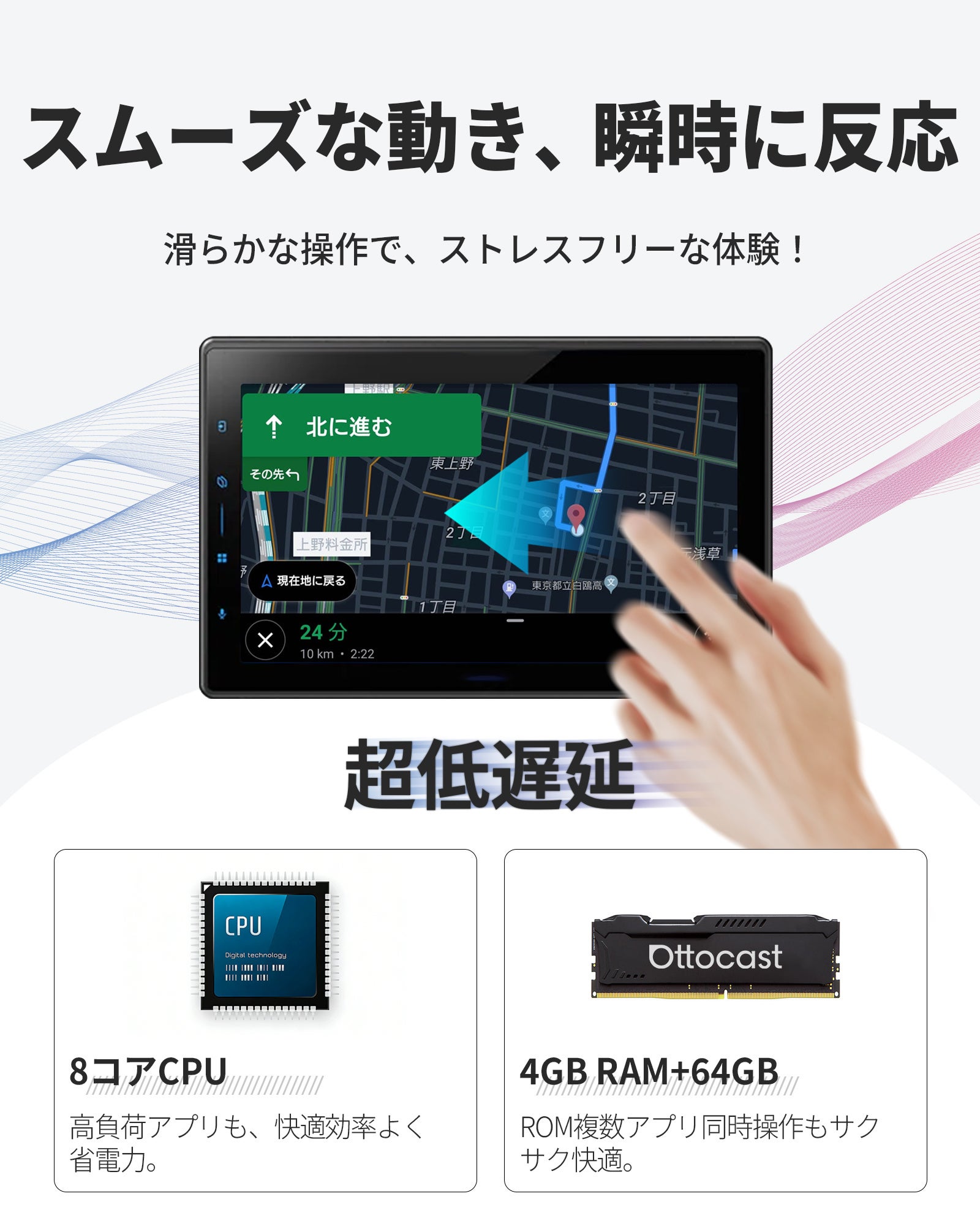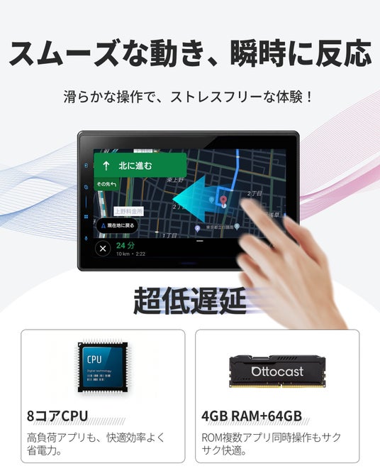 8コアCPUと4GB RAM+64GB ROMを搭載し、アプリの起動や画面切り替えもスムーズに動作。ナビ操作や動画再生、複数アプリの同時使用でももたつきを感じさせず、快適で安定した車内エンタメ環境を実現します。ソフトウェアはオンラインで更新できます。