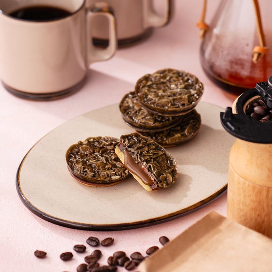コーヒーが香るカリッとしたアーモンドフロランタンが力強く広がり、続いてヘーゼルナッツのまろやかにとろけるコクと甘みが広がります。それぞれの素材が持つ個性を際立たせながらも、互いを引き立て、やさしく重なり合います。