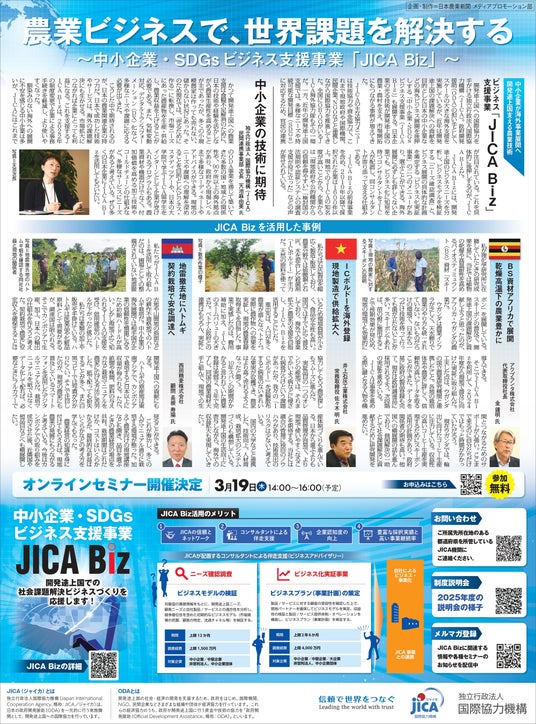 中小企業・SDGsビジネス支援事業(JICA Biz)の事業説明や、JICA Bizを活用して農業分野での海外への事業展開に取り組んだ企業の事例紹介を配信します。