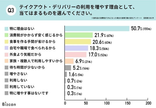 - テイクアウト・デリバリーの利用が増やす理由として「消費税がかからず安い」と「食事を作る手間が省ける」がほぼ同率の結果に