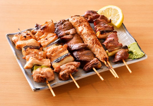 ・ 焼き鳥 盛り合わせ(3 本):1,200 円(たれ/塩) ・ 焼き鳥 盛り合わせ(5 本):2,000 円(たれ/塩)
