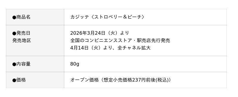 株式会社ロッテ(東京都新宿区、代表取締役社長執行役員:中島英樹、以下ロッテ)は「カジッテ〈ストロベリー&ピーチ〉」を2026年3月24日(火)にコンビニエンスストア・駅売店先行で発売します。「カジッテ」はロッテ独自の「果実感引き立て製法」を用い、ハードグミの新ブランドとして2025年8月に発売しました。ひと口カジった瞬間に、ハードな食感と広がる果実感が楽しめるこだわりの味わいとマーモットを使ったプロモーションによってSNSを中心に話題が広まったことで、出荷実績は計画比の約150%(*)と好調です。仕事中の小腹満たしやリフレッシュしたいときなどに、ぜひお楽しみください。