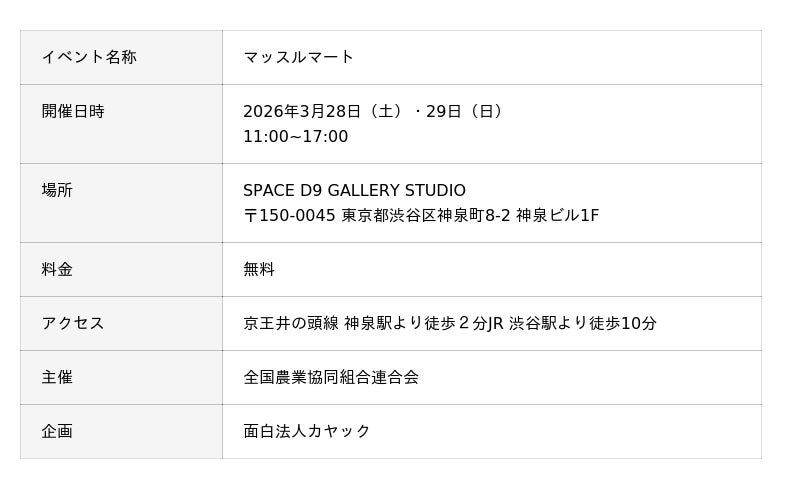 株式会社カヤック(本社:神奈川県鎌倉市、代表取締役CEO:柳澤大輔、以下「面白法人カヤック」)は、全国農業協同組合連合会(本所:東京都千代田区、代表理事理事長:桑田義文、以下「JA全農」)が推進するスキムミルク(脱脂粉乳)の認知拡大と利用促進施策として、マッチョ店員が接客する体験型コンビニエンスストア「マッスルマート」の企画・制作を行いました。 本イベントは、2026年3月28日(土)・29日(日)の2日間、東京・渋谷にて期間限定でオープンします。