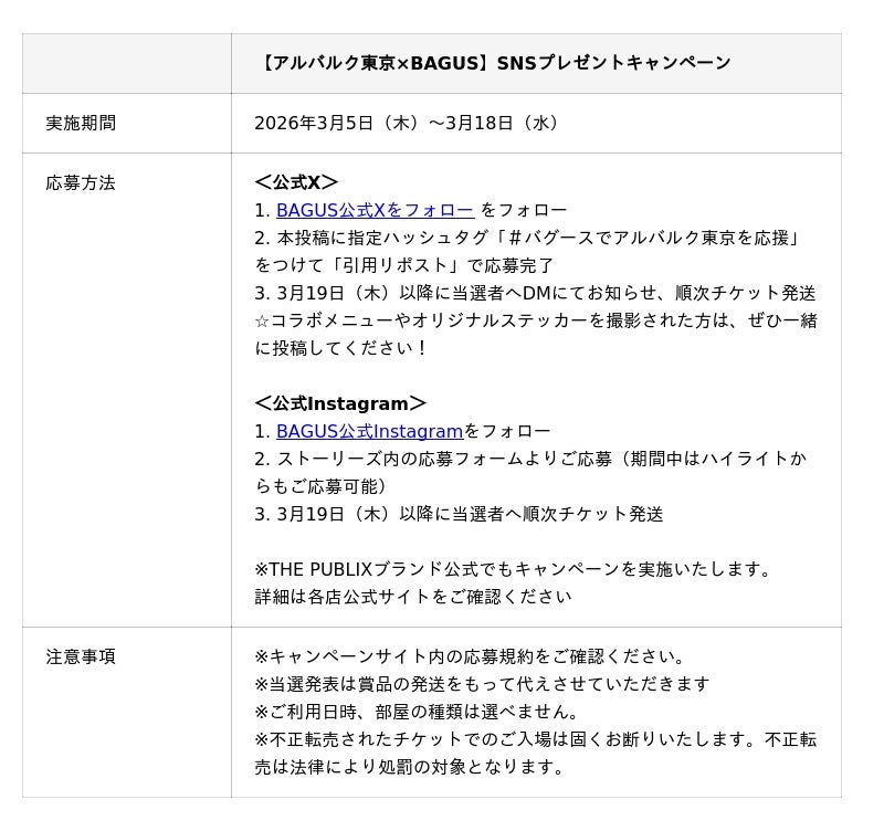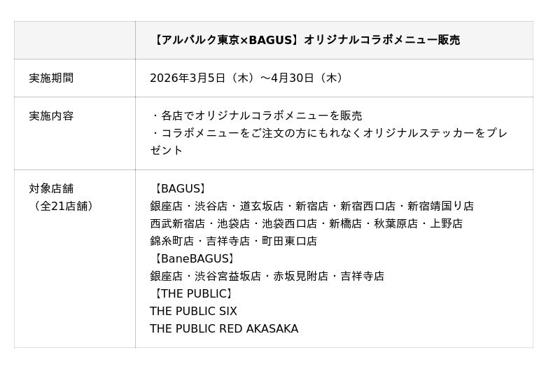 3月5日(木)からスタートする【アルバルク東京 × BAGUS】コラボキャンペーンでは、アルバルク東京のチームカラーや世界観をイメージした限定コラボメニューを販売。コラボメニューをご注文いただいた方に、もれなくクラブのマスコットキャラクター“ルーク”のオリジナルステッカーをプレゼントいたします。さらにBAGUS公式X・Instagramにて、プレミアムな観戦空間「JAPAN AIRLINES テラススイート」ペアチケットが抽選で当たるプレゼントキャンペーンも開催いたします。キャンペーン期間中、店内に設置されたモニターでアルバルク東京の試合を放映しております。 大人の遊び場「バグース」、ガストロパブ&スポーツバー「THE PUBLIC」で、バスケットボールの熱狂とともに、特別なコラボメニューをお楽しみください。