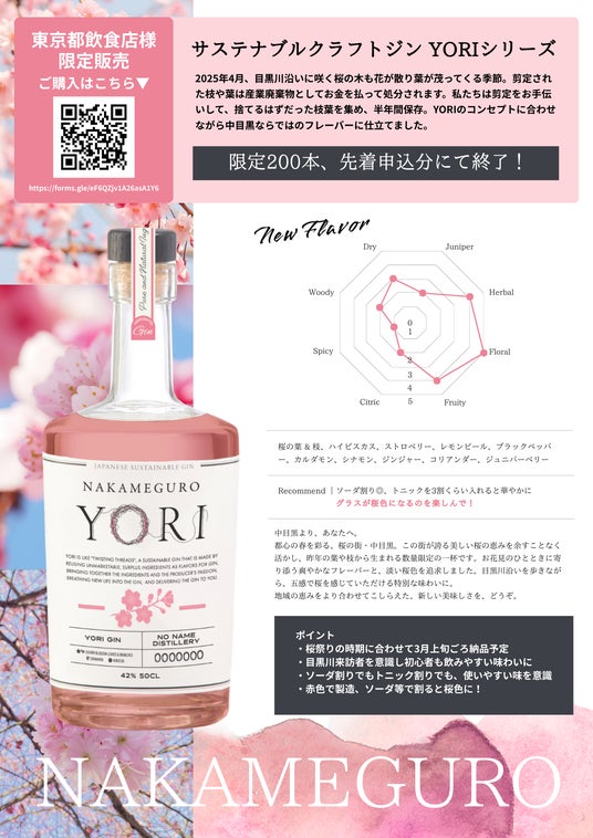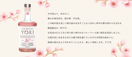 株式会社 Connec.t(本社:東京都渋谷区、代表取締役:小口潤)、並びに国産サステナブルジン“YORI”を手がけるプロジェクトチーム「NO NAME DISTILLERY(ノーネーム ディスティラリー)」は、「YORI」の最新作として、東京都目黒区中目黒の桜をアップサイクルした『NAKAMEGURO』を、2025年3月上旬より東京都内飲食店限定で発売いたします。