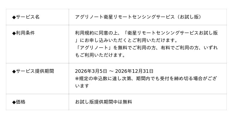 「アグリノート」は、本サービスが加わることで、生育状況に応じた作業計画の立案から、作業結果の記録や振り返りまでを一括して管理可能となり、生産者の経営改善を強力にサポートします。 さらに、本連携によるお試し版の提供を通じて、新しいサービスの普及促進とともに、ユーザーの利用状況や作業負荷を把握し、省力化、収量安定化、生育管理に貢献するサービスの検証を進め、2027年シーズンの正式展開を目指していきます。