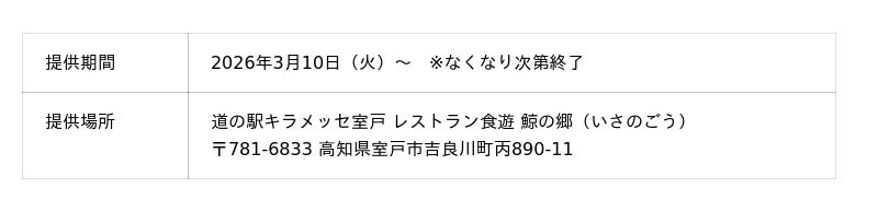 シートのデザインには、室戸の世界ジオパークの象徴である「タービダイト(地層)」が広がる浜辺に、クジラが寄り添うメインビジュアルを採用しました。地域の民話を、お食事と一緒にぜひお楽しみください。