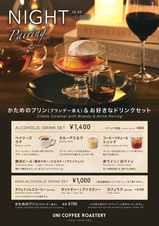 株式会社GRACE(本社:神奈川県横浜市、代表取締役:沢村 優太)が展開するカフェ『UNI COFFEE ROASTERY(ユニコーヒーロースタリー)』は、2026年3月6日(金)18時より、人気メニュー「かためのプリン」に芳醇なブランデーを添えた“夜限定”メニューと、アルコールを含む選べるドリンクのセット販売を、横浜モアーズ限定で開始いたします。