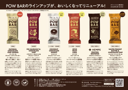 今回リニューアルされた4SKUに加え、既存の人気フレーバー【塩ピーナッツチョコレートチップ】【+HEMPS プロテインブラウニー】を含め、POW BARは全6SKU体制へと拡張します。これにより、アウトドアはもちろん、朝食、オフィスワーク、移動中、日常のおやつなど、さまざまなライフスタイルに寄り添う商品ラインナップとなりました。
