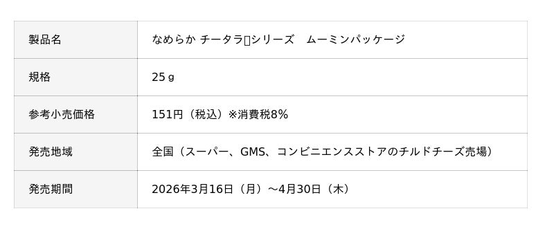 株式会社なとり(本社:東京都北区 会長兼社長:名取三郎)は、「なめらか チータラ」シリーズ【要冷蔵】全5品の「ムーミン」パッケージを期間限定で2026年3月中旬より順次発売します。