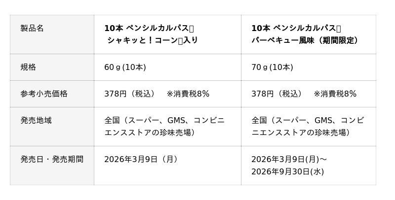 シャキッと!コーン(R)入り」、「10本 ペンシルカルパス(R) バーベキュー風味」(期間限定)を3月9日(月)より新たに発売いたします。
