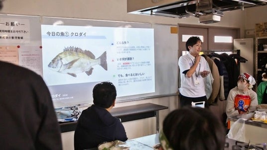 調理が終わると、株式会社アノニギワヰより、今日の見学の背景と調理した魚たちが抱える海の課題についてお話しがありました。 東京湾には700種を超える豊富な生物・珍しい生物がいることや、これまで東京湾でとれる魚たちは変わってきたこと、東京湾には知られていないが多くの課題があることなどを紹介。「クロダイや海苔、ホンビノス貝、サルボウガイをとってみてもこれだけ影響を受けている。海と深い関わりのある市川だからこそ海に興味をもってほしい。具体的なアクションでなくともよいので、まずはスーパーや鮮魚店の魚の旬・価格・適地(生息域)の変化から関心の幅を広げていただけたらうれしいと思います。」と呼びかけました。