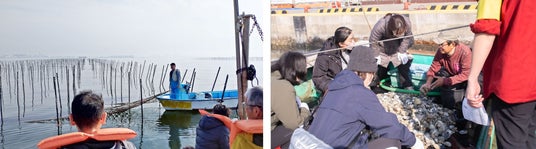 海上で海苔養殖の説明を受ける様子(左)、底引き網漁船で貝の選別を体験する様子(右)