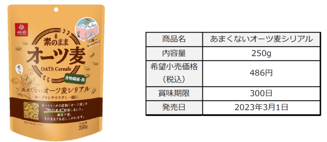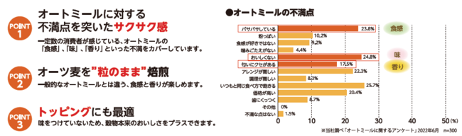 本商品は「焙煎のみのシンプルな加工で、サクサク食べやすく。混ぜる・かけるだけでおいしさ、満足感をプラス」をコンセプトに、オートミールの不満点(食感・味・香り)を原料であるオーツ麦を焙煎することで解消した商品になっています。