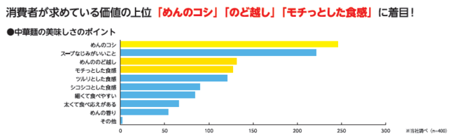 また、中華麺に関する調査※2を実施したところ、「めんのコシ」、「のど越し」、「食感」を美味しさのポイントとして重視していることが分かりました。