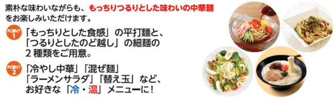 本商品は、中華麺に求める美味しさのニーズに応えるべく、当社が長年行ってきた麺づくりの技術を用いて「めんのコシ」はもちろん、食感に特化した「もっちりとした食感の平打麺」、のど越しに特化した「つるりとしたのど越しの細麺」の2種類をご用意。麺だけなのでアレンジも自在で、春夏は「冷やし中華」や「混ぜ麺」として、秋冬は「鍋の〆」や「ラーメン」に。「替え玉」にもお使いいただける商品になっています。