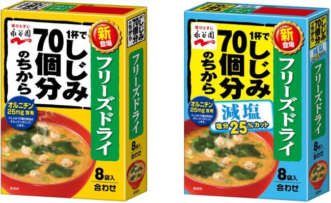 株式会社 永谷園(社長:成田 健一、東京都港区)は、1 食当たり25mg のオルニチンを含有した、フリーズドライ製法の粉末みそを使用した即席みそ汁「フリーズドライ1 杯でしじみ70 個分のちからみそ汁 8 袋入」「同 減塩8 袋入」(税抜318 円)を、2023 年3 月13 日(月)より全国にて発売いたします。