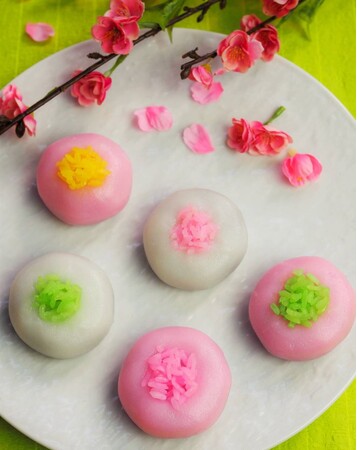いが饅頭とは、あんこを米粉の皮で包み、表面に着色したお米をのせた和菓子のこと。