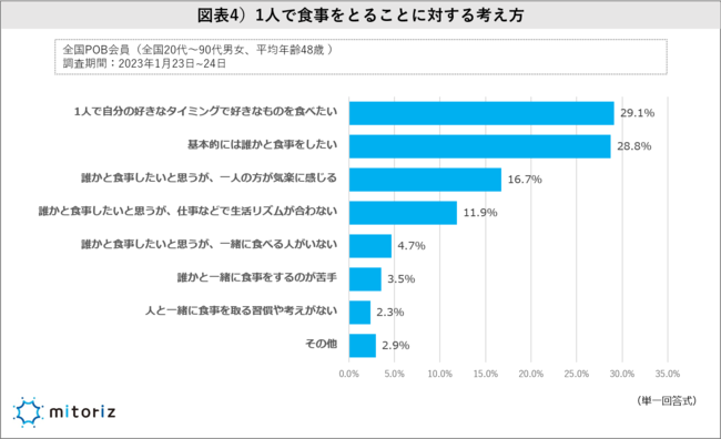 続いて「1人で食事をとることに対する考え方と現状について」最も近いもの回答してもらいました。「1人で好きなタイミングで好きなものを食べたい(29.1%)」と、あえて1人で食べたい派の人が最も多い結果となった一方で、「基本的には誰かと食事をしたい(28.8%)」もほぼ同じ割合となり、次いで、誰かと食事したいと思うが…「一人の方が気楽に感じる(16.7%)」「仕事などで生活リズムが合わない(11.9%)」「一緒に食べる人がいない(4.7%)」といった回答が続きました。この誰かと食事をしたいと考えているものの、前向きではない・出来ていないという回答は合わせると33.3%の割合を占めており、食事をとることに対する考え方が多様化していることが伺えます(図表4)。