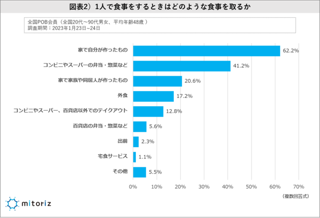 続いて「1人で食事をするときに何を食べることが多いか」を尋ねたところ、最も多かったのは「家で自分が作ったもの(62.2%)」で、次いで「コンビニやスーパーの弁当・惣菜(41.2%)」、「家で家族や同居人が作ったもの(20.6%)」と続き、「外食(17.2%)」と一人の食事で飲食店を利用する人はあまり多くなく、家で自炊して食べる人が多いことがわかりました(図表2)。