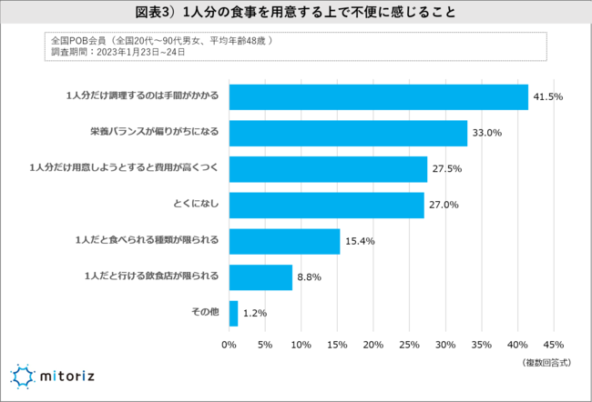 続いて、「1人分の食事を用意する上で不便に感じること」を尋ねました。回答が最も多かったのは「1人分だけ調理するのは手間がかかる(41.5%)」、次いで「栄養バランスが偏りがちになる(33.0%)」、「費用が高くつく(27.5%)」という結果となりました(図表3)。